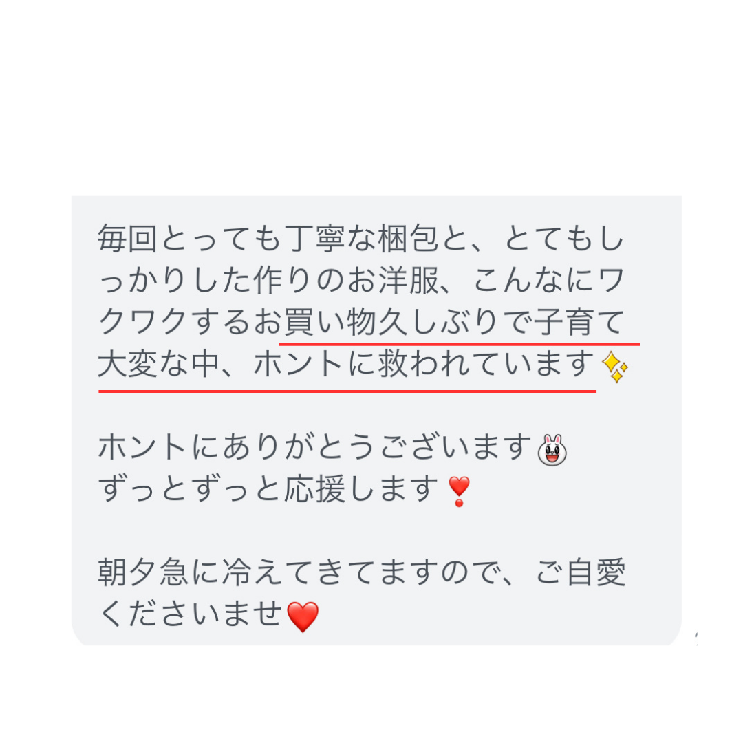 デザインいつも可愛いです。これ着てると本当に褒められますし、目を引きます。ただ、縫製に少々難が…。職人さんがされているので仕方ないかもしれませんが縫製がもう少ししっかり丈夫に改善されると嬉しいです。