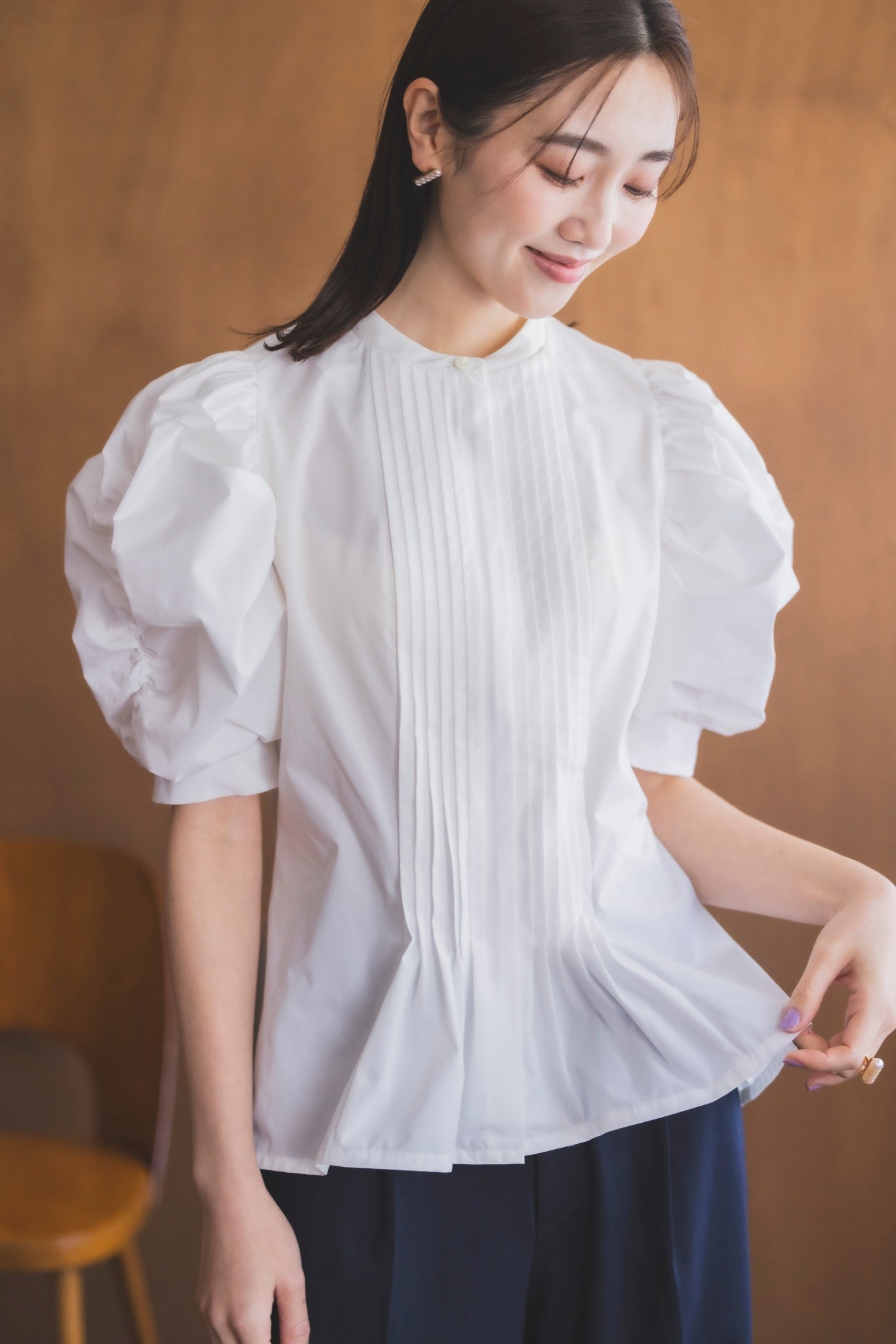 イージーケア。しっかり素材の撥水加工シャツ。胸元のフリルは派手すぎずハレの日にぴったりです。フロントジッパーで着脱も授乳もラクラク。
