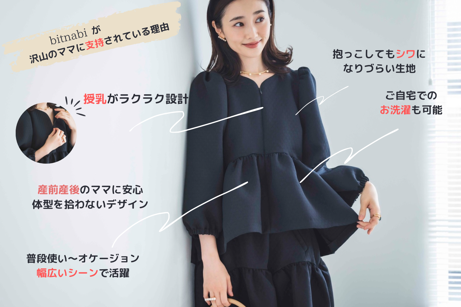 襟は取り外し可能。アクセによって使い分け可能です。切り替えの下には授乳チャックも。機能性も高級感も兼ね揃えた一枚持っておきたいワンピース。