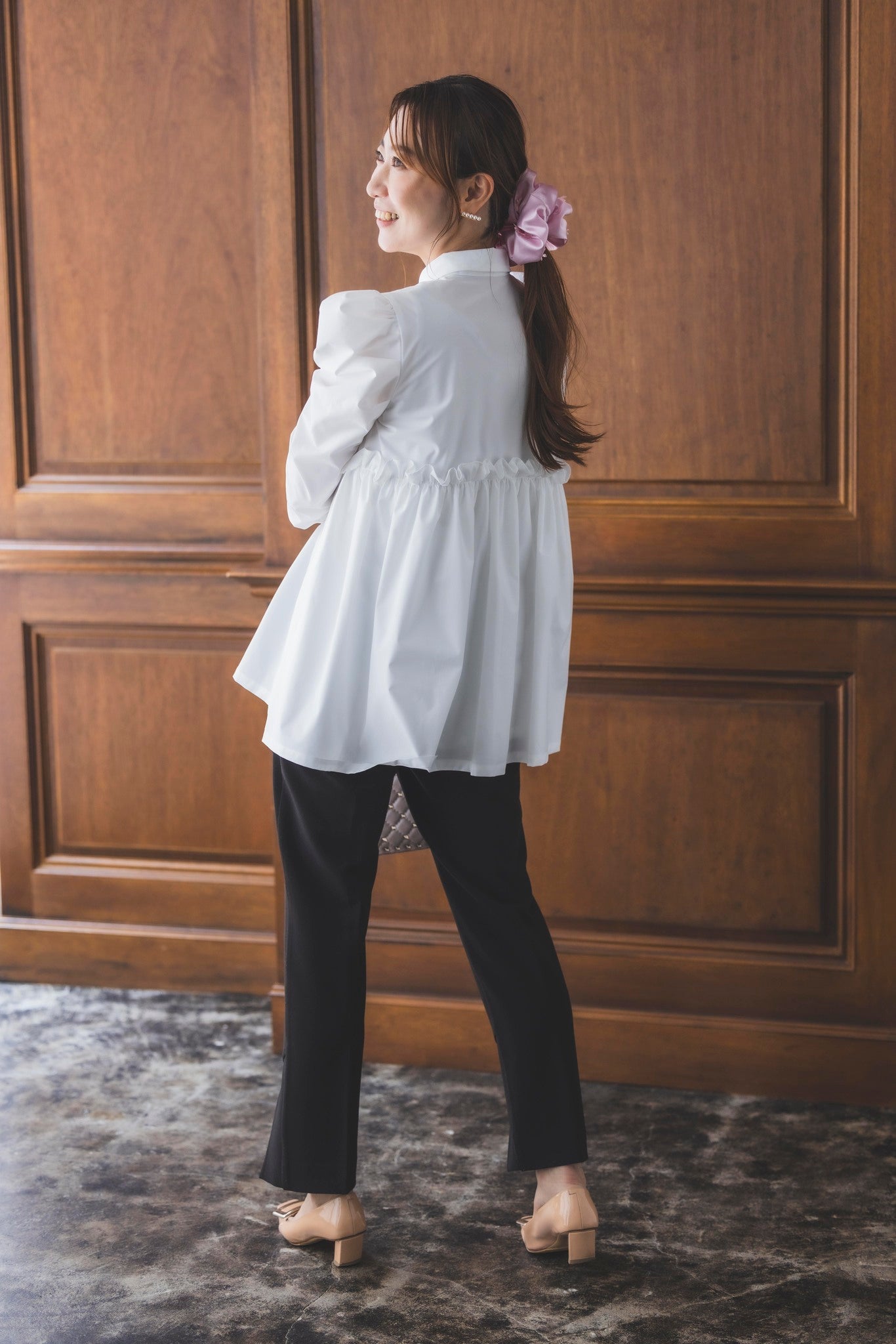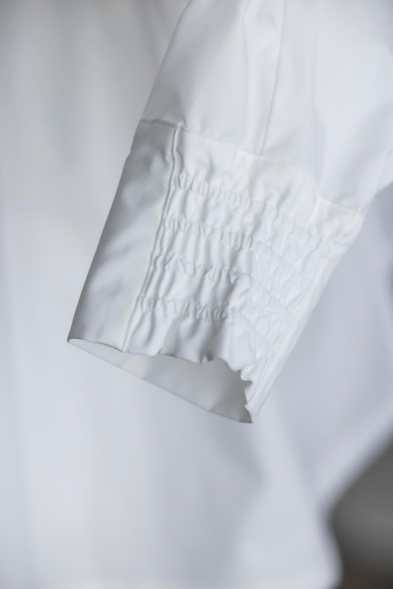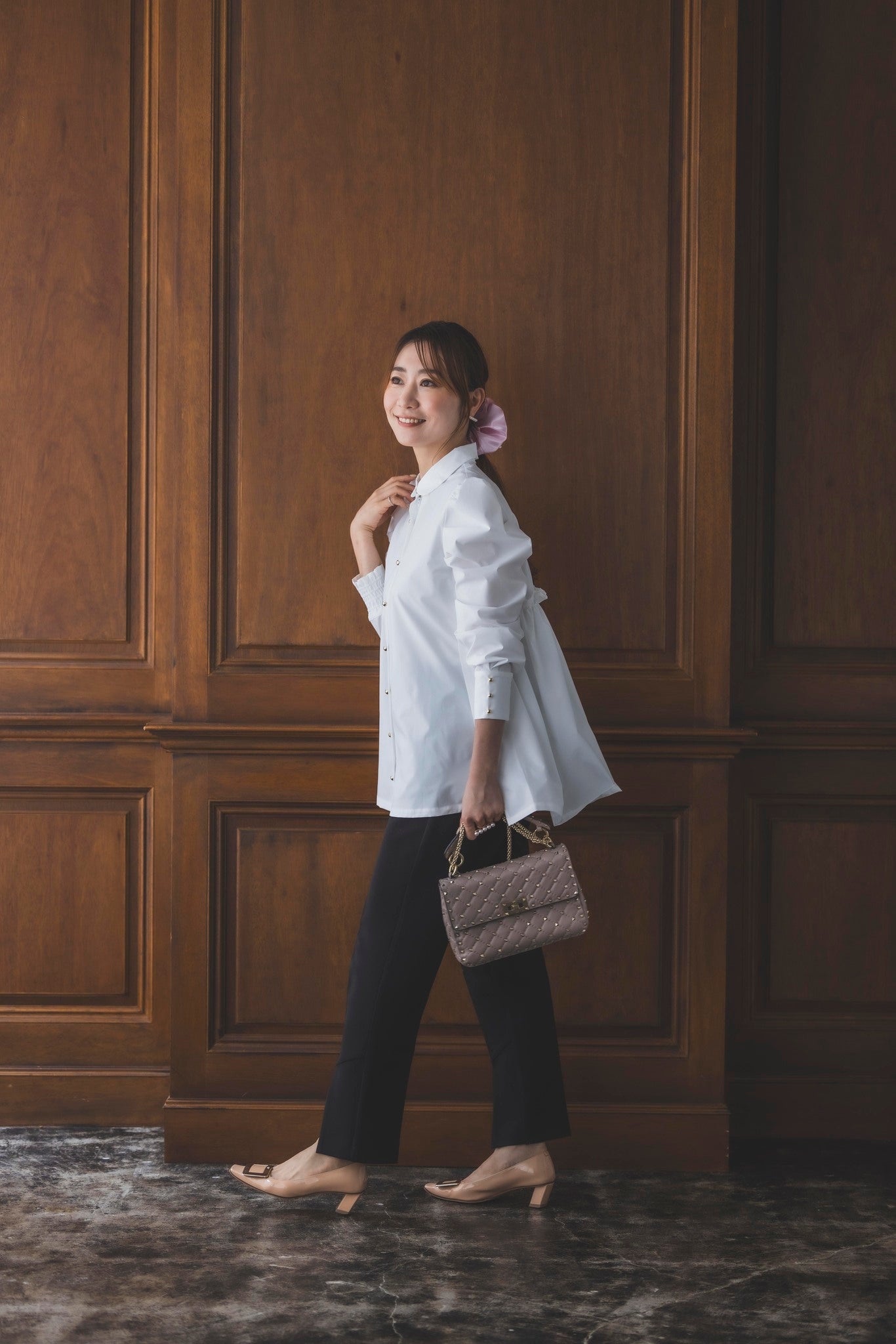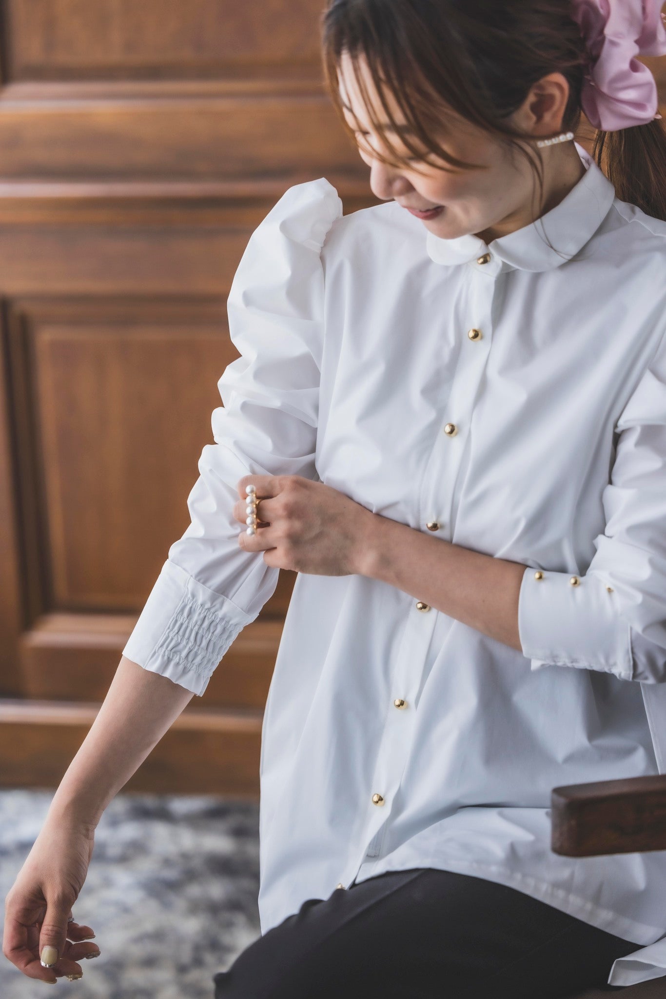ビンナヌンシャツは「輝くシャツ」という意味です。お生地は撥水加工が施されているので、母乳が沁みる心配がございません。上のお子様がジュースをこぼしたり、コーヒーをこぼしても大丈夫です。高級感のあるゴールドのボタンは実は飾りボタンで、下にチャックが隠れているので、授乳もさっと出来て、着脱も簡単。袖部分も一部シャーリングを施しているので腕まくりが出来て、忙しいママにぴったりです。前向きで輝きたいママに着て欲しい一枚です。